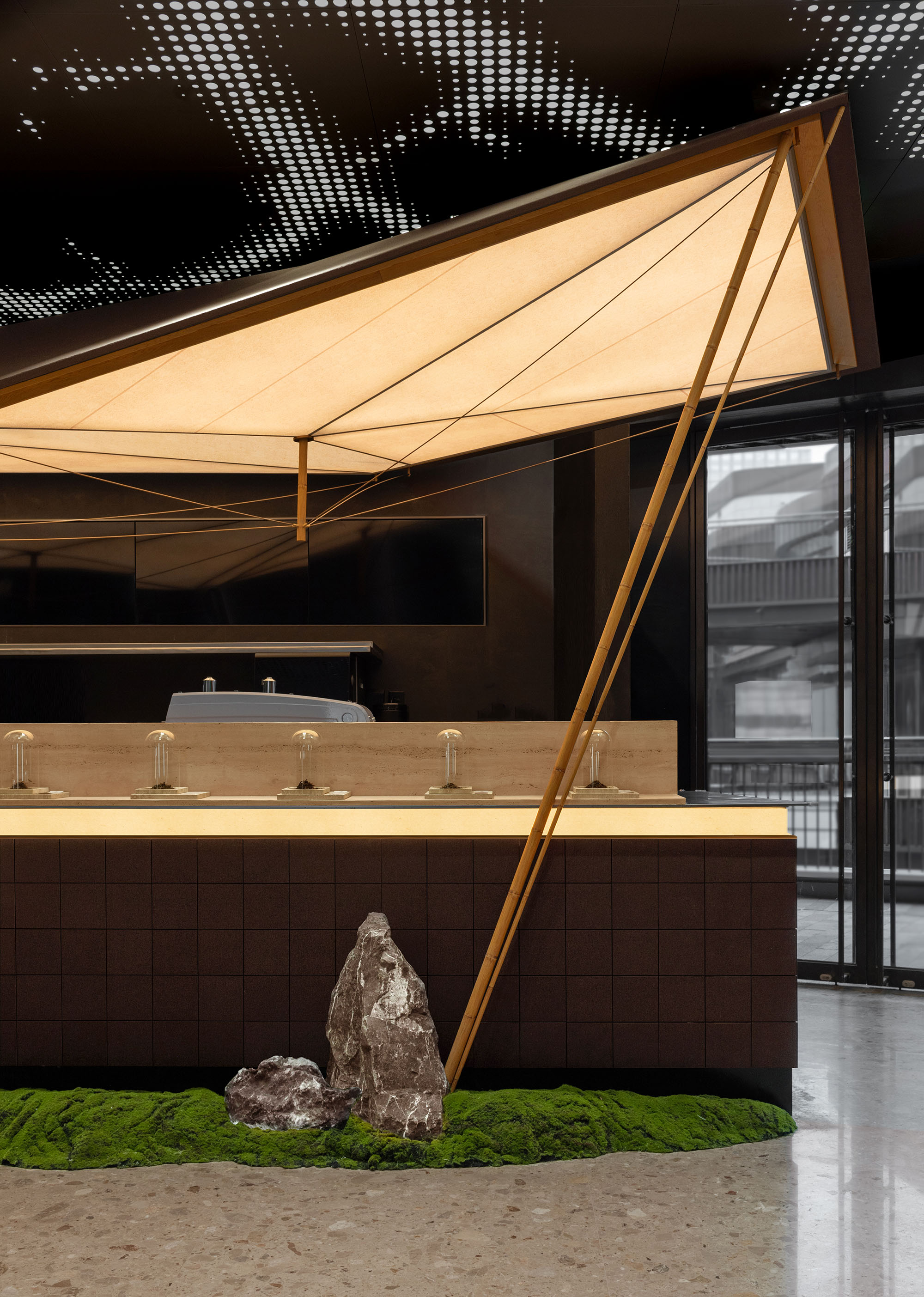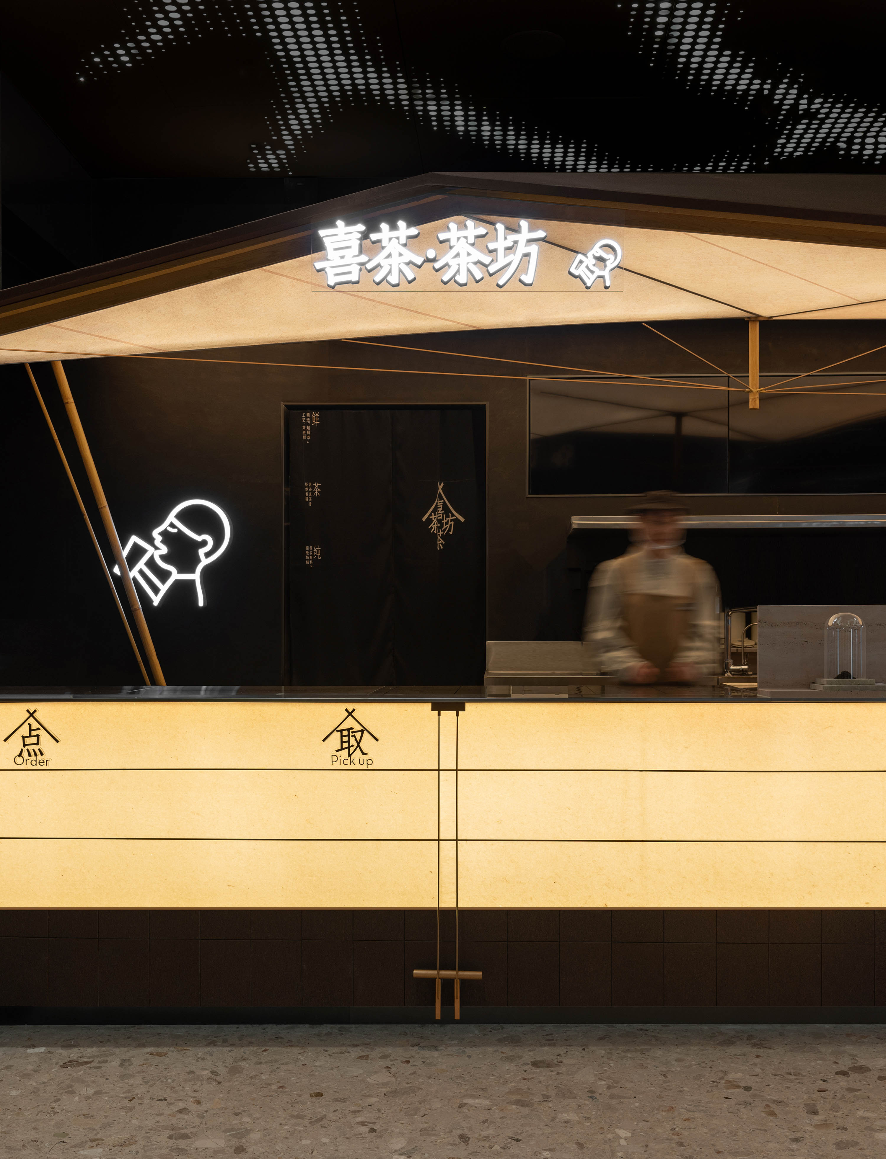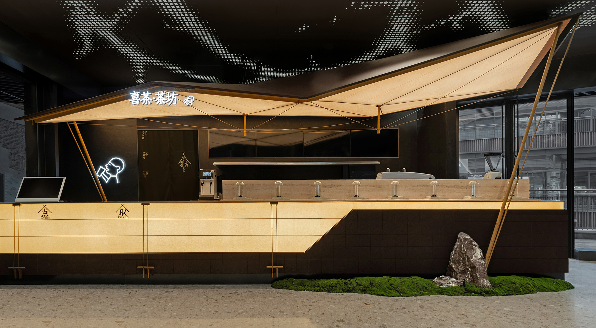 在场地条件有限的前提下,我们目的是通过设计策略让空间视觉张力最大化,提升品牌终端势能。我们通过将空间装置化设计的策略思路,结合喜茶茶坊宋式美学文化的品牌底蕴,打破空间界限,帮助品牌更容易被识别和被传播。