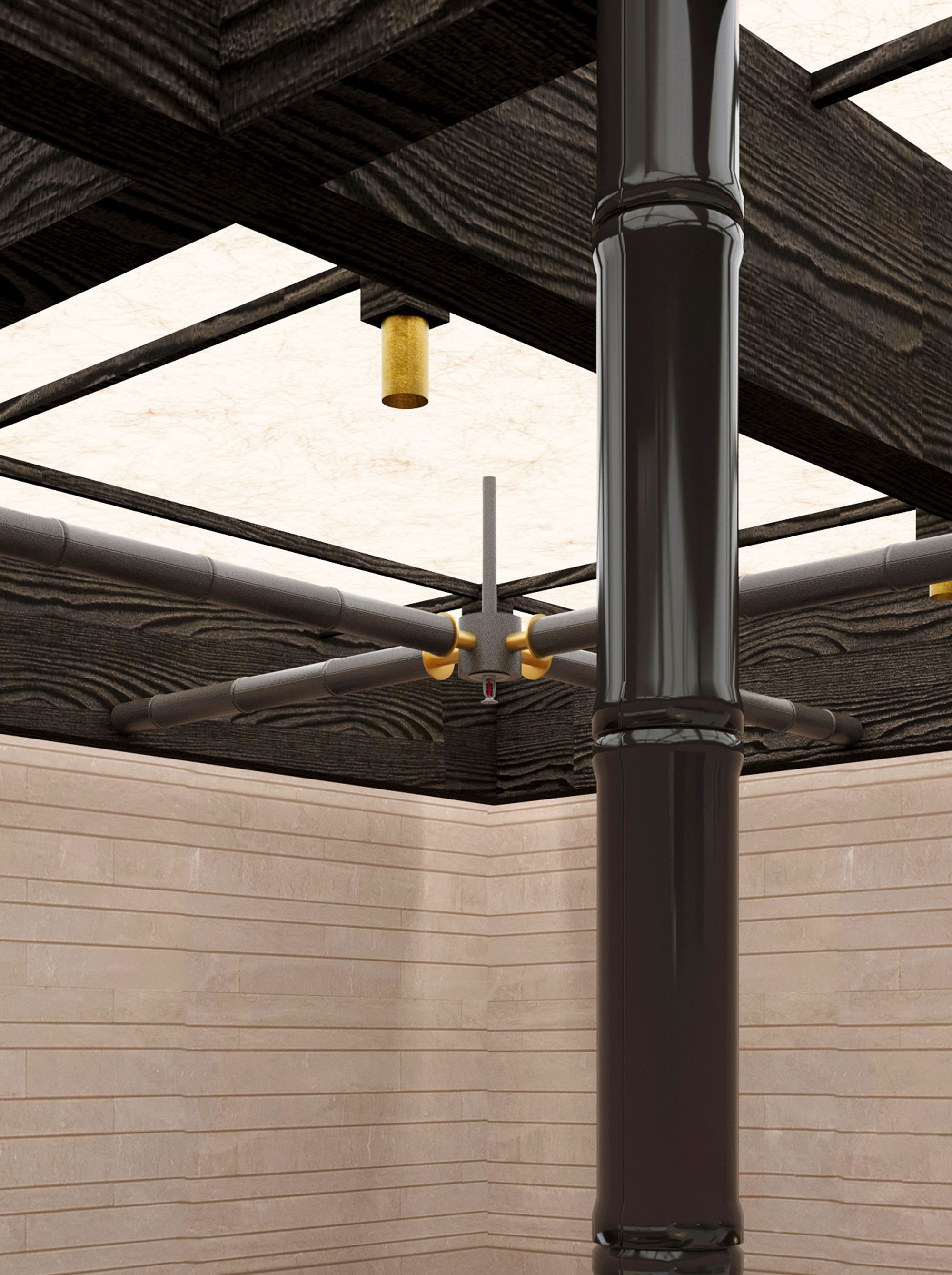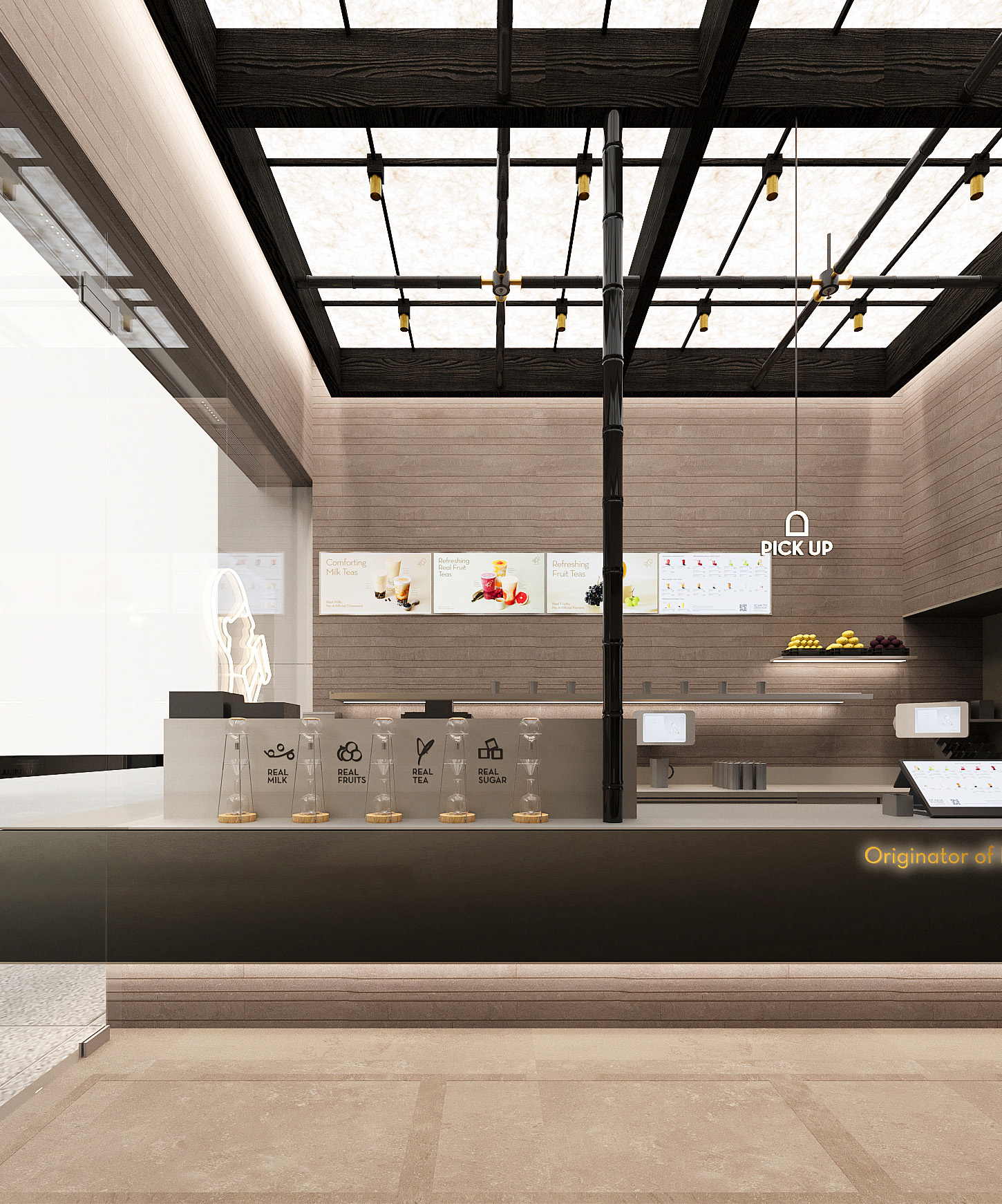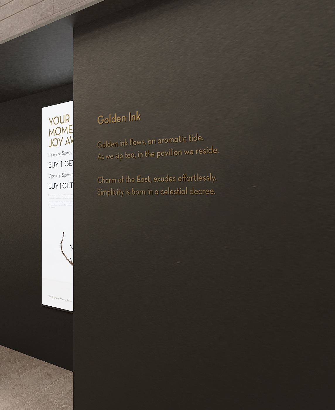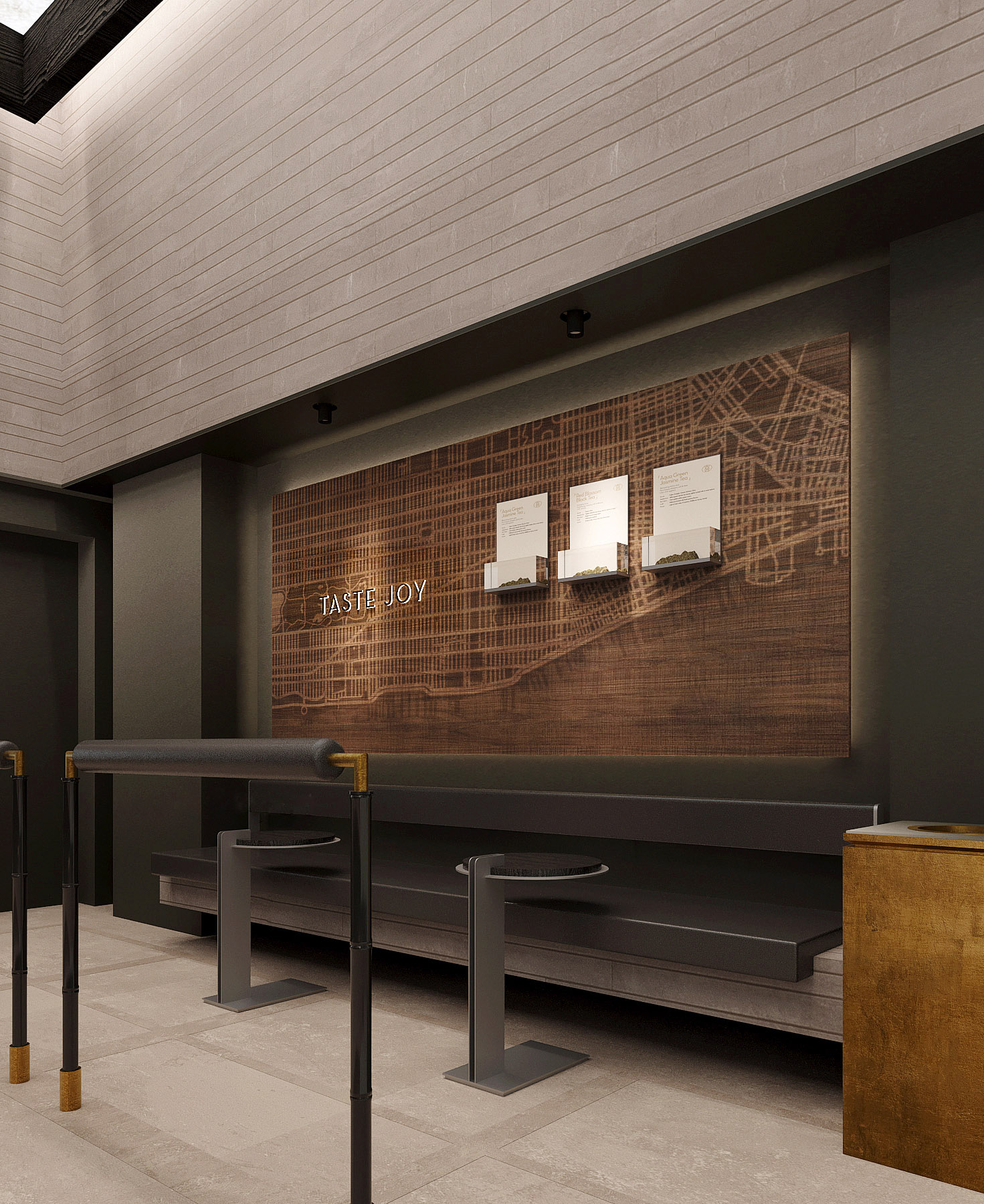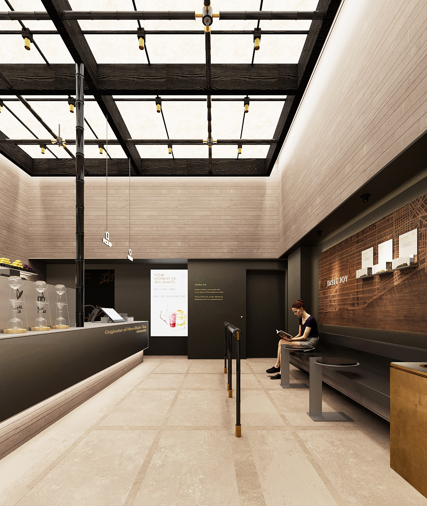 作为喜茶在美国的首家主题店面,我们希望将现代东方文化融入并呈现于曼哈顿。墨韵与金香交相辉映,尽显中国传统文化的深邃底蕴。闲亭饮茶是东方文化中亭院的现代化表达,植入空间后借此体现中国茶文化的多维体验。空间中木刻的曼哈顿城市地图肌理,以在地的视角传达东方灵感之茶的精神内涵,建立起更强的品牌文化与价值认同感。