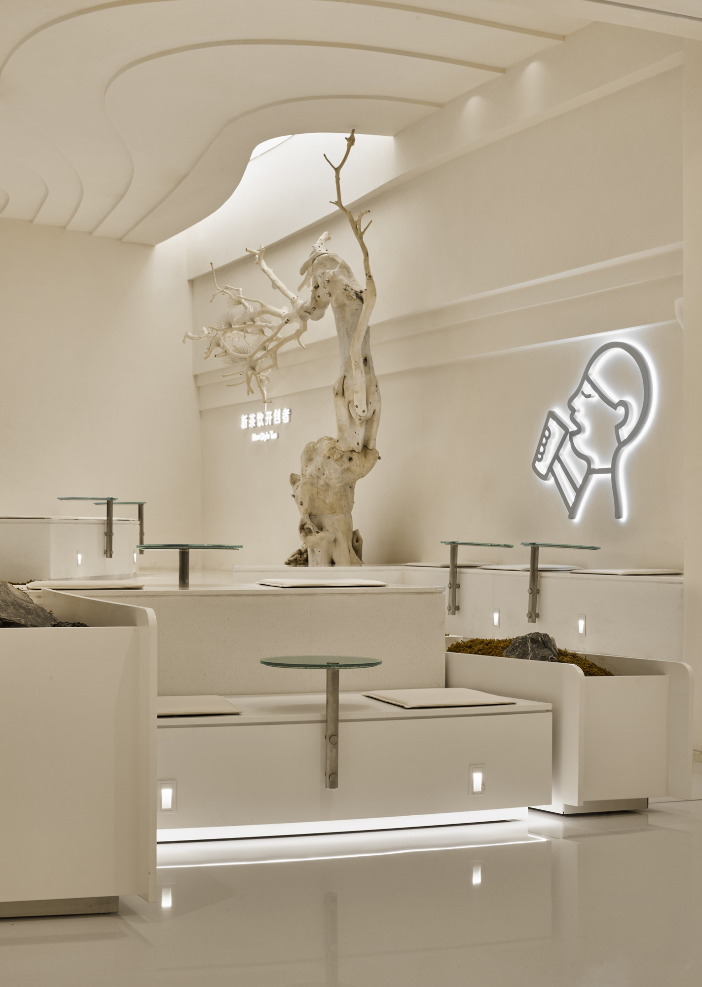 项目位于云南昆明,我们提取云南茶山的形态,巧妙地将茶树的转换与运用融入其中,使整个空间形态变得立体而多维,丰富而流动。置身其间,仿若徜徉于茶山之间,与自然融为一体。同时,将室内客区向外延伸,拓展出一片更为灵动的空间,为茶客们提供了一个趣味而舒适的休憩之所。在这里,在地性与东方极简之美得以展现,散发着独特的文化韵味与诗意魅力。