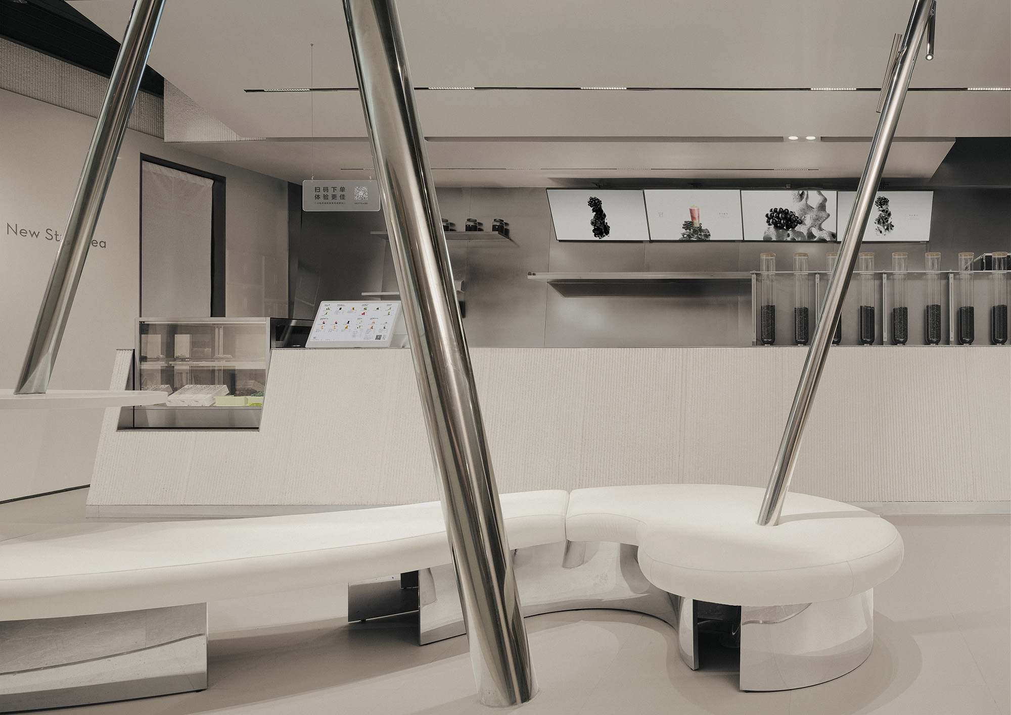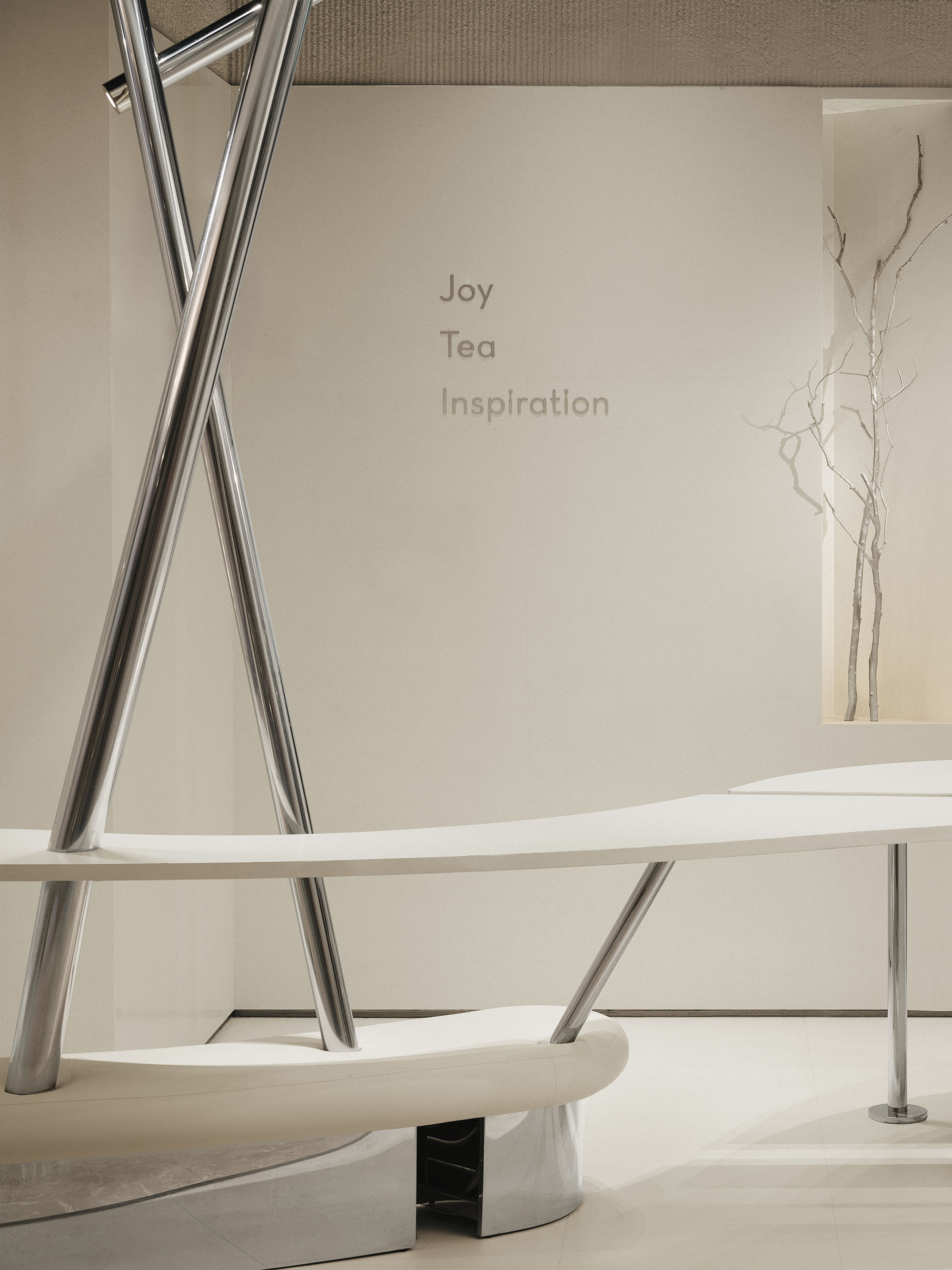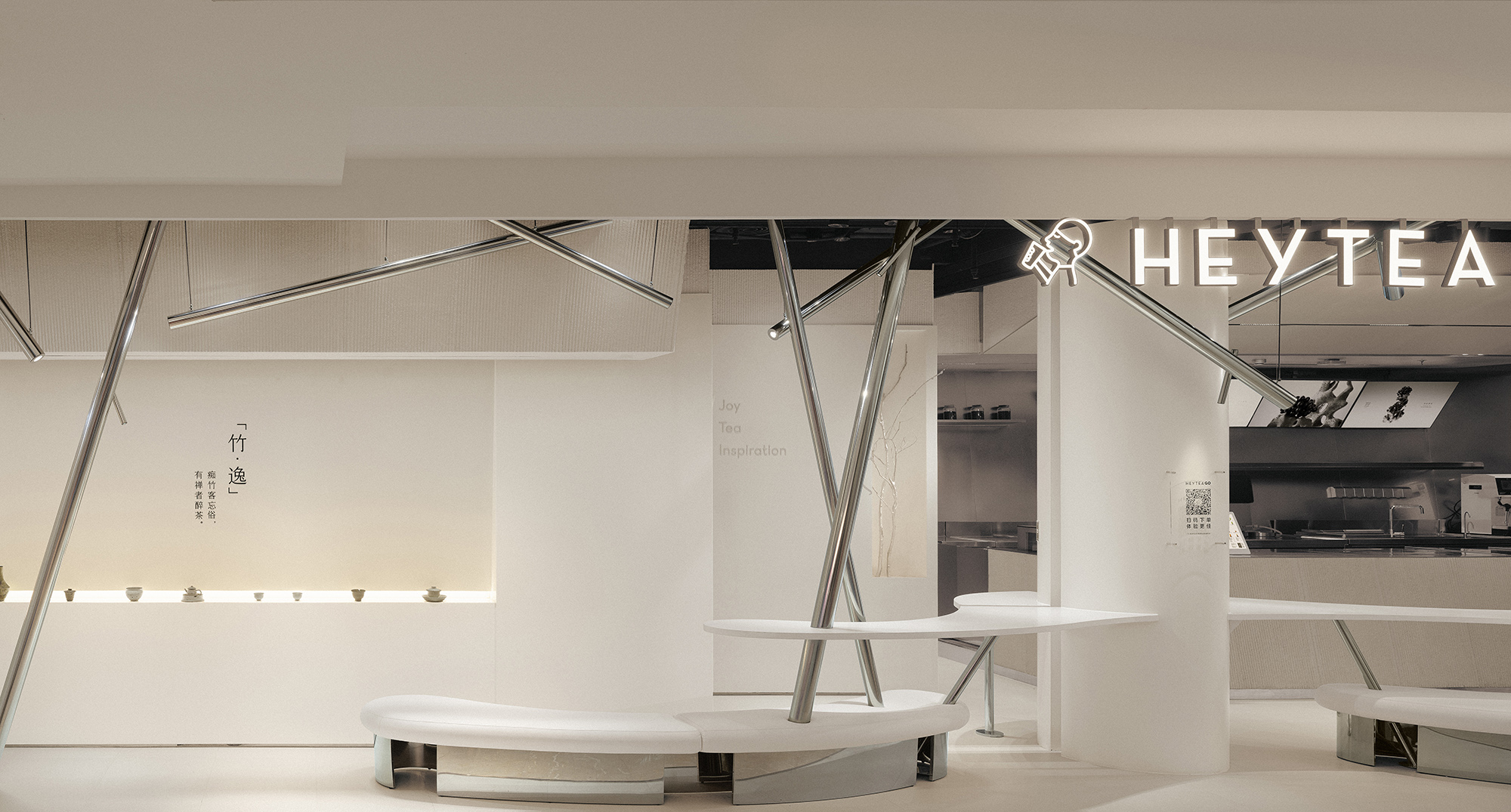 将东方元素融合呈现在空间,展现人在竹林中饮茶的意境,虚实结合,让观者步入竹林之中,所到之处,层层交错。以竹进行超现实联想,融合当代建筑常用材料,以新的艺术形态在茶饮空间展现。白墙黛瓦,雅竹、银灰与陶器三者相映 室中竹林,器物各得其所,茶事井然有序。