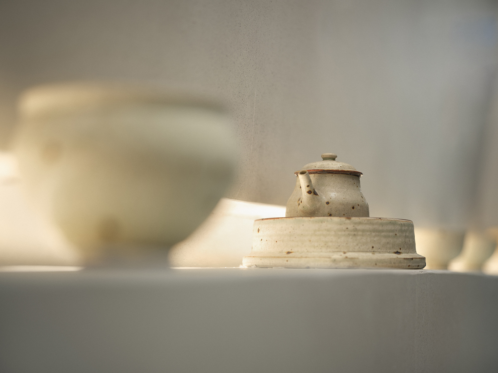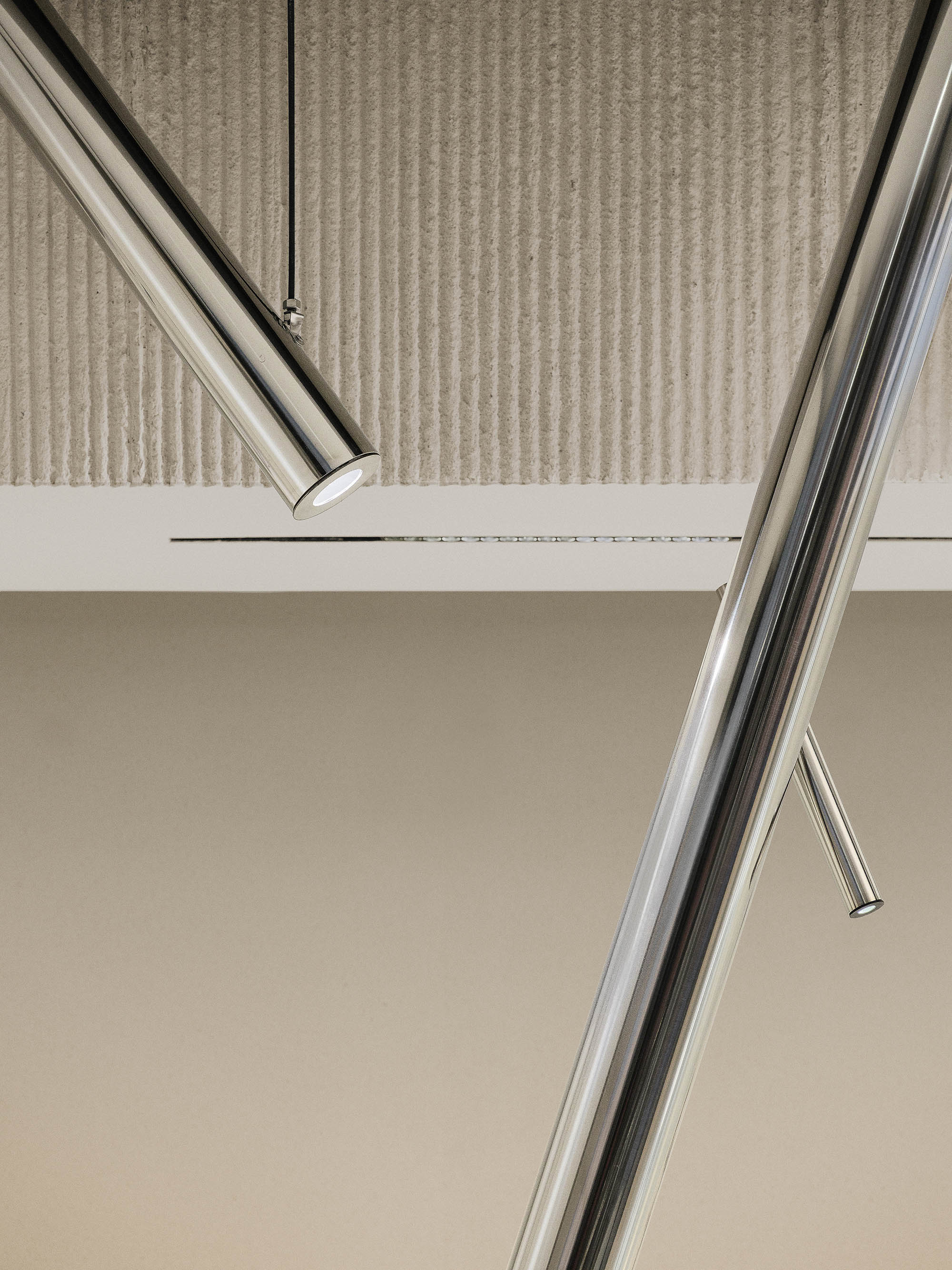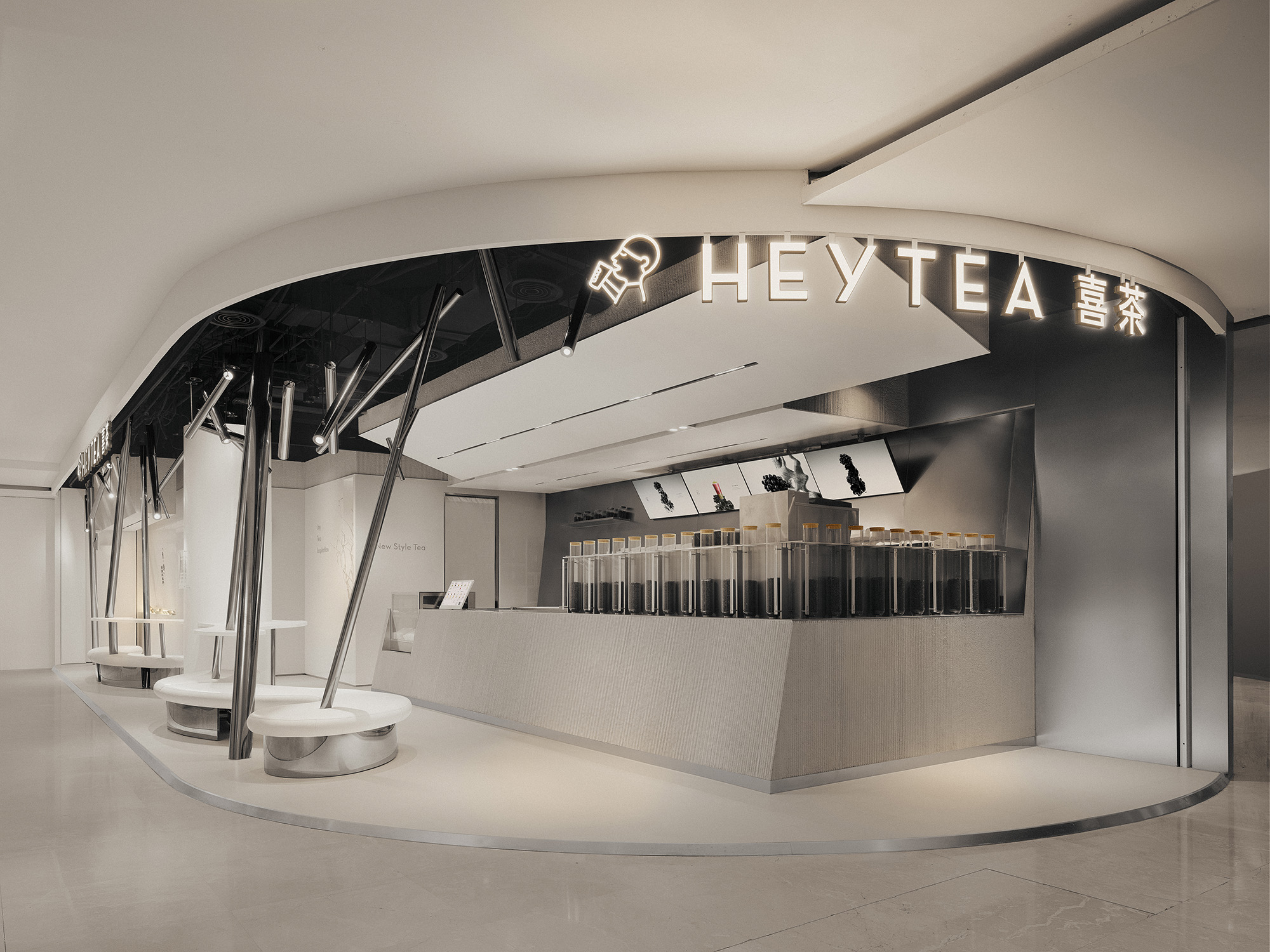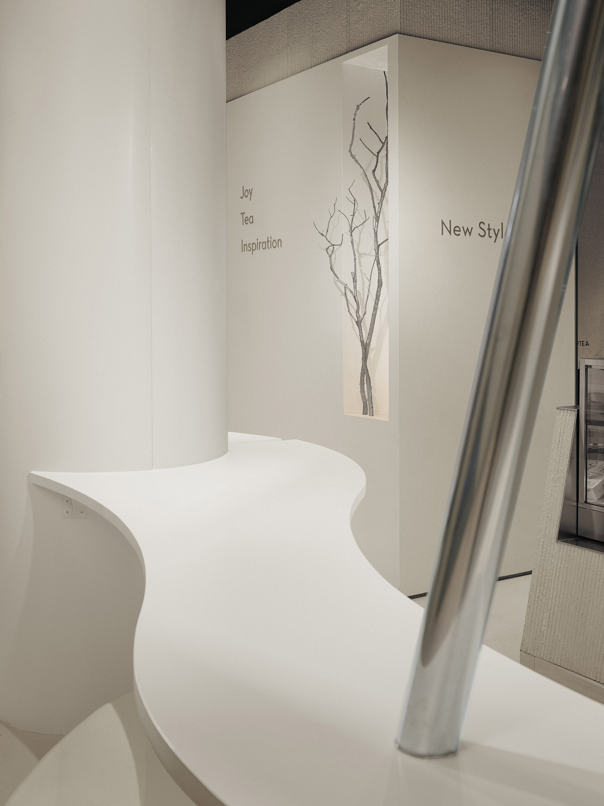 将东方元素融合呈现在空间,展现人在竹林中饮茶的意境,虚实结合,让观者步入竹林之中,所到之处,层层交错。以竹进行超现实联想,融合当代建筑常用材料,以新的艺术形态在茶饮空间展现。白墙黛瓦,雅竹、银灰与陶器三者相映 室中竹林,器物各得其所,茶事井然有序。