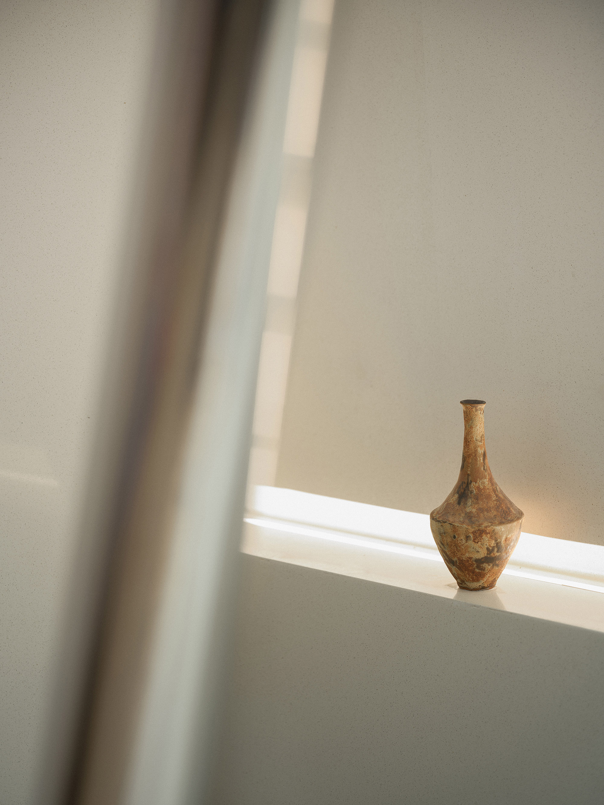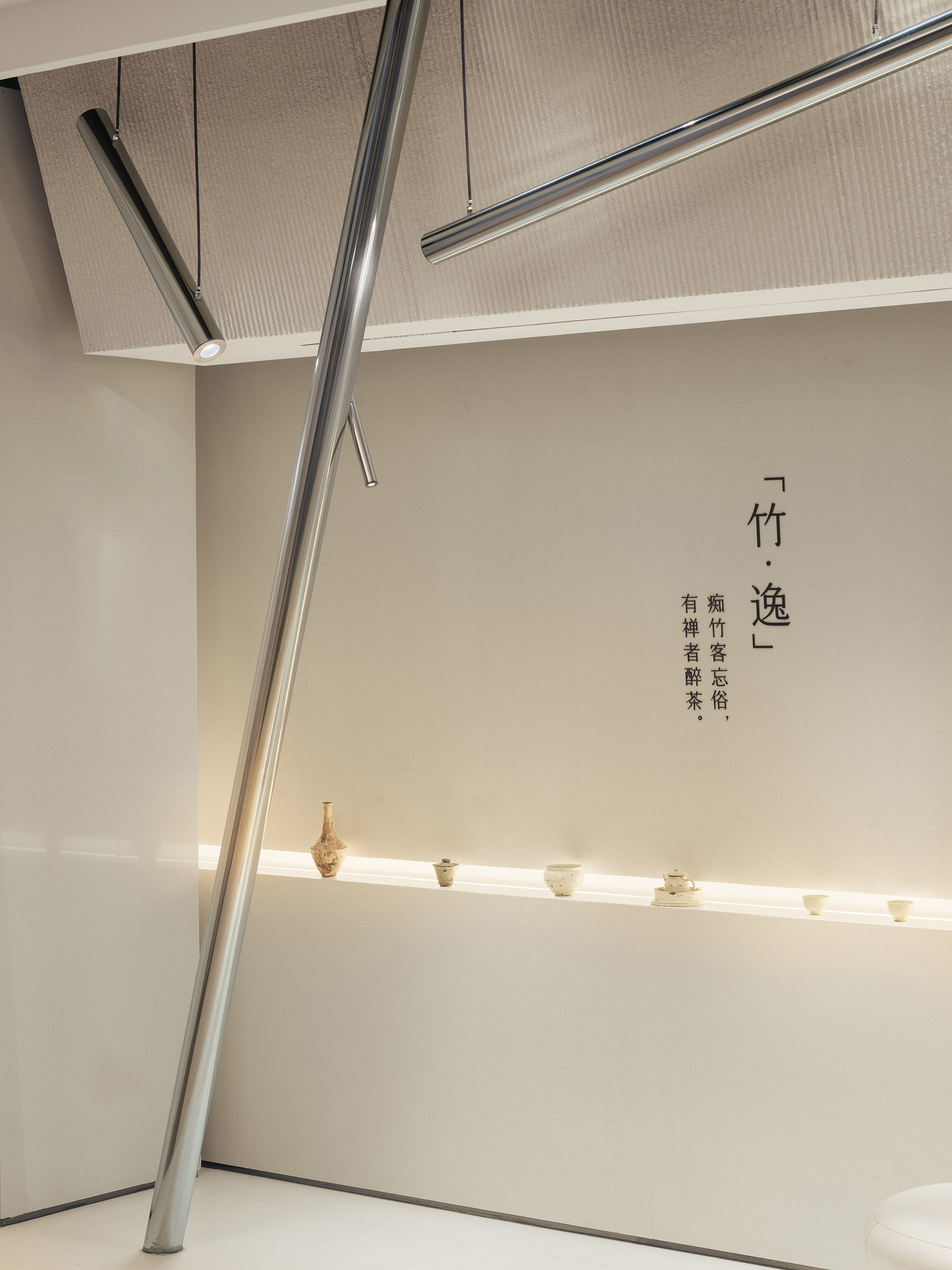 Integrating Eastern elements into the space, showcasing the artistic conception of drinking tea in the bamboo forest, combining reality and virtuality, allowing viewers to step into the bamboo forest and interweave layer by layer wherever they go. Using bamboo for surreal association, integrating commonly used materials in contemporary architecture, and presenting a new artistic form in the tea drinking space. White walls and black tiles, elegant bamboo, silver ash, and pottery complement each other in the bamboo forest in the room. Each utensil is in its own place, and the tea ceremony is well-organized.